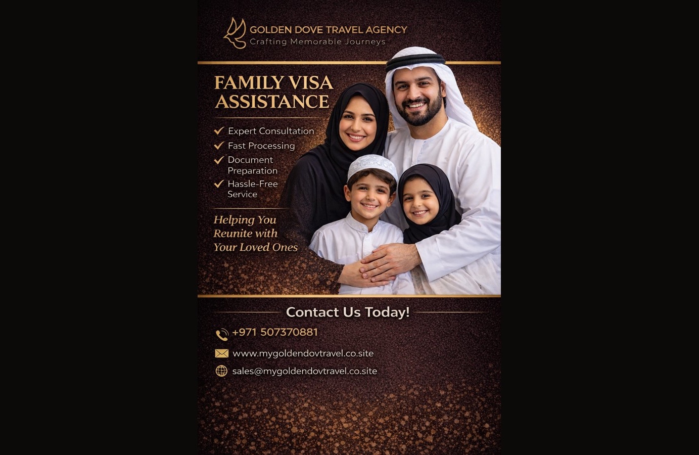 Golden Dove Travel and Tours, we pride ourselves on offering customized vacation packages, expert-guided tours, and personalized travel planning services. Our commitment is to ensure that your travel experience is effortless and enjoyable from start to finish. Whether you're seeking a relaxing getaway or an adventurous exploration, we tailor every aspect of your journey to meet your specific needs and preferences. With our expertise and attention to detail, we take the stress out of planning your perfect trip, letting you focus on making unforgettable memories. Trust us to create a travel experience that reflects your unique desires and ensures that you have a seamless journey every step of the way.